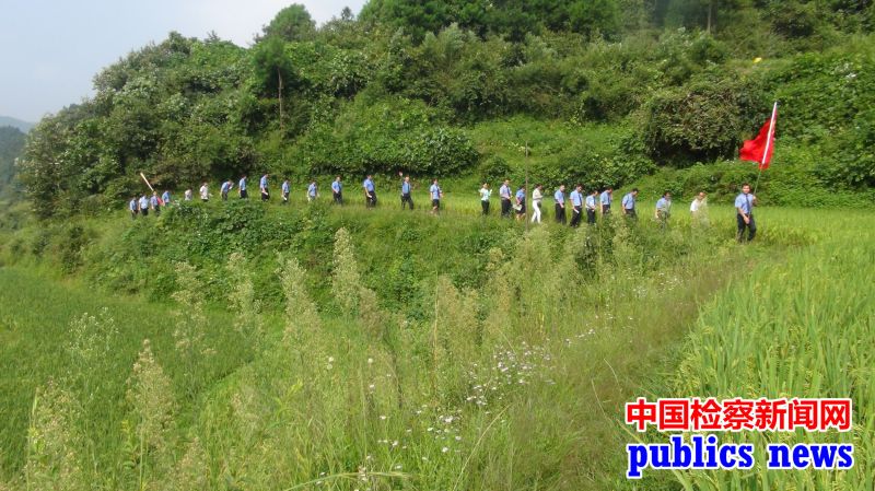 当天一大早,全体检察干警们来到良上乡小巴冶(地名)集合参加活动,在翟庆杰副检察长发表动员讲话后,邀请当地一村民作向导,在他的引路下,开始了重走长征路的征程。踏着革命先烈的足迹,感受红军不畏艰险、勇往直前的革命情怀,一路上,向导给全体干警讲解了红军当时经过良上乡的情景。那是1934年9月26日中国工农红军第六兵团任弼时、肖克的部队长征在剑河县与敌人激战一天,27日转到三穗县良上宿营,过巴冶、岑松、施秉到龙里,绕贵阳过思南上遵义。大约2000余人的部队在这里虽然只停留了十多个小时,但是有三名红军战士因身负重伤牺牲了而长眠于此。停留时间虽然短暂,却给这里留下了很感人的故事。全体检察干警触景生情,唱起了革命歌曲,向前向前向前!我们的队伍向太阳.......顶着烈日,迎着火辣辣的太阳,队伍在蜿蜒盘旋的崎岖山路上前进,《中国人民解放军进行曲》、《打靶归来》等革命歌曲在良上山谷间激情回荡。全体检察干警沿着当年红军经过的线路徒步前进,经过2小时10分,行程5公里,到达良上红军纪念碑。