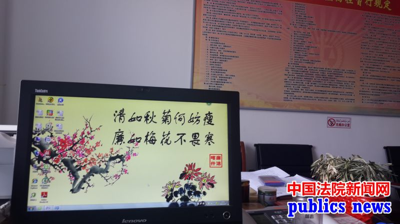 在伽师县人民法院随意打开一台计算机,就可以看到:清如秋菊何妨瘦、廉如梅花不畏寒,静以修身、廉以养德,劲松立险处、正气显人格,全心全意地干、争分夺秒地干、务求实效地干,勤政重在廉、做人重在诚、说话重在信、办事重在实,责任重如山、名利淡如水等廉政名言、名句和莲花、寒梅、莲藕、青竹等廉政画卷、风景,画面新颖、美观大方、令人耳目一新。