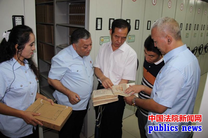 自治区高院宣教处于会堂在中院党组副书记、院长依尔夏提·吾斯曼的陪同下查看案卷材料。