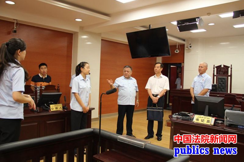 自治区高院宣教处处长于会堂参观喀什中院审判科技法庭。