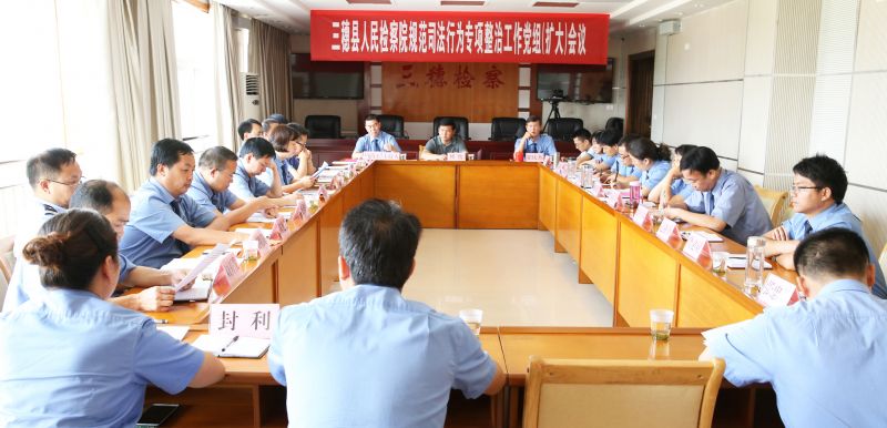 全民公众讯(杨政富)为进一步推进规范司法行为专项整治工作,力求把问题找准找实,在通过前期广泛征求意见建议,认真查摆存在的问题,深刻剖析原因以及提出具体整改措施的基础上,8月6日,三穗县人民检察院召开规范司法行为专项整治工作党组(扩大)会议,黔东南州检察院党组副书记、常务副检察长傅俊莅临指导。该院领导班子成员、检委会委员、各部门负责人以及专项整治办全体成员参加会议。会议由该院党组成员、副检察长杨腾干主持。